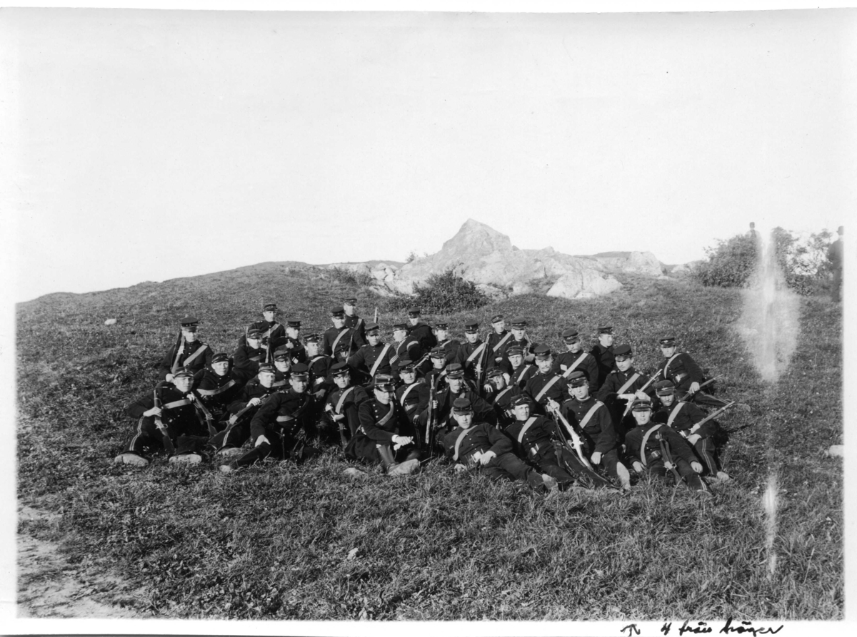 Beväringar i Svea artilleri, 3:e avdelningen, 2:a batteriet, 1892. N Strindberg fyra fr höger.