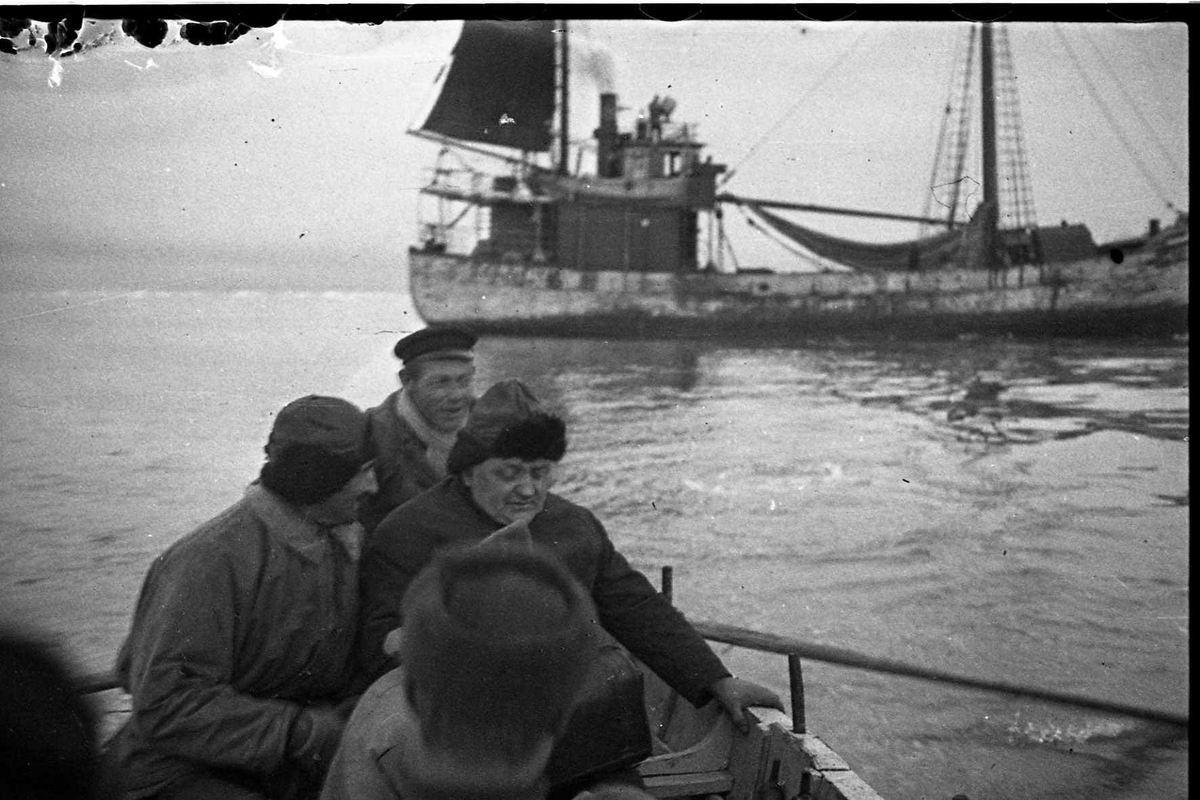 Överfart från Isbjörn till Vitön. Möjligen Sörensen längst bak och Stubbendorff i förgrunden. Till höger däremellan sitter Myhre.