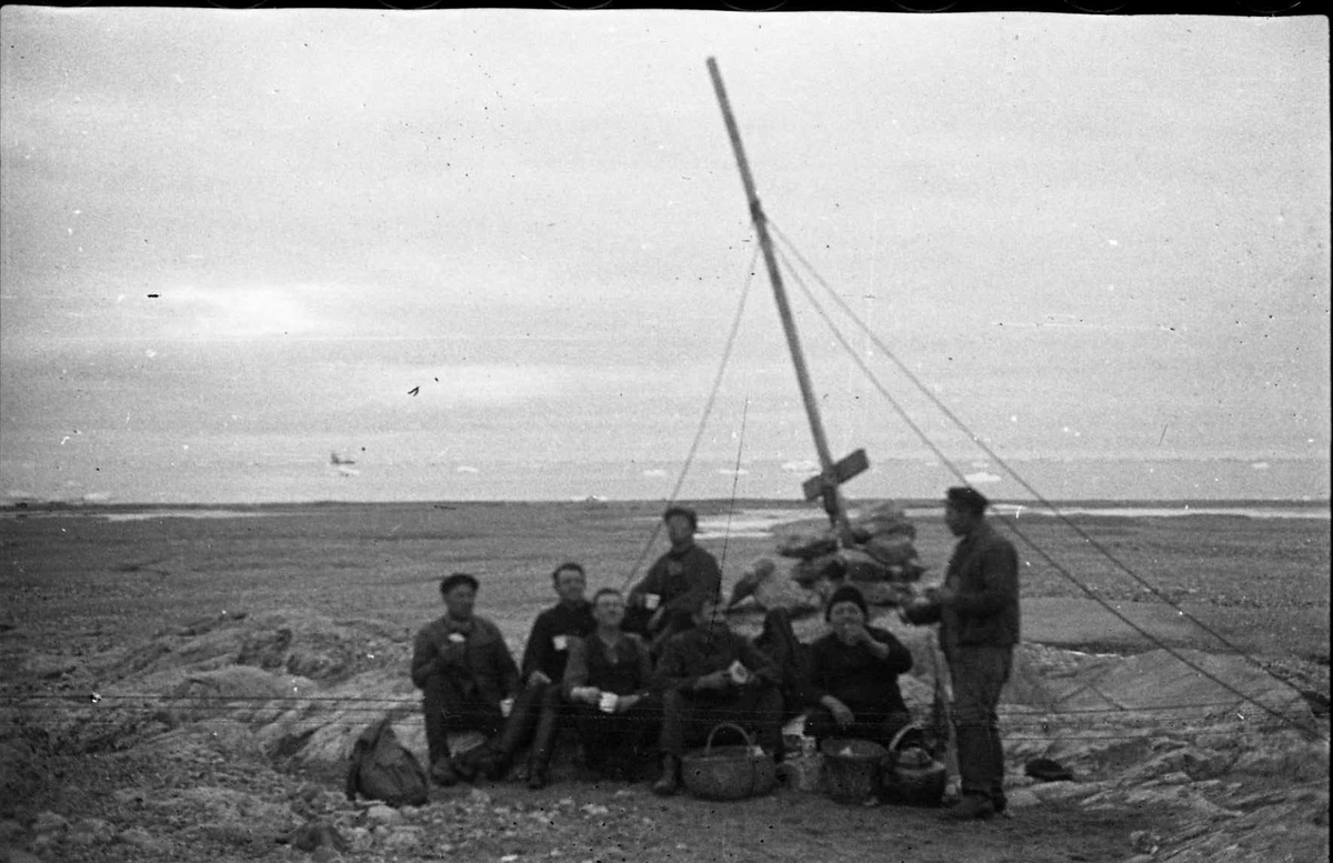 Fika vid Horns varde som markerar fyndplatsen av Andréelägret på Vitön. Stubbendorff till vänster.