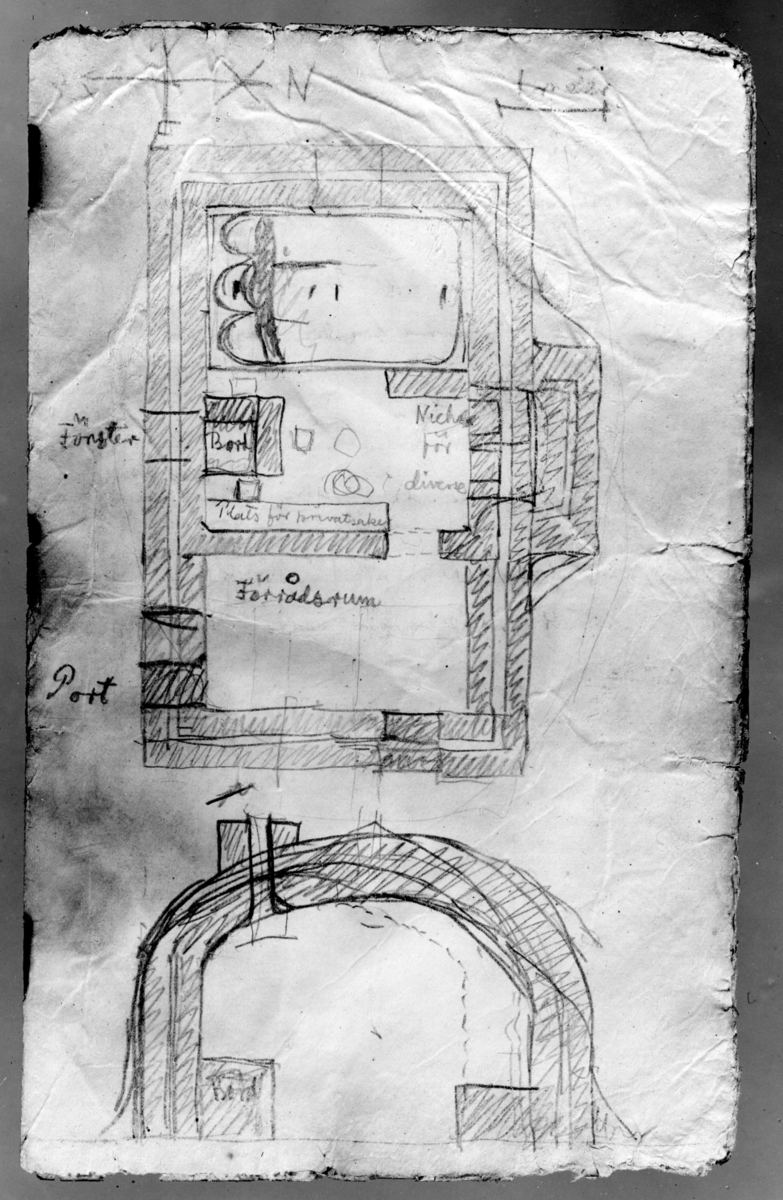 Skiss på ishyddan "Hemmet", ur N Strindbergs observationsbok.