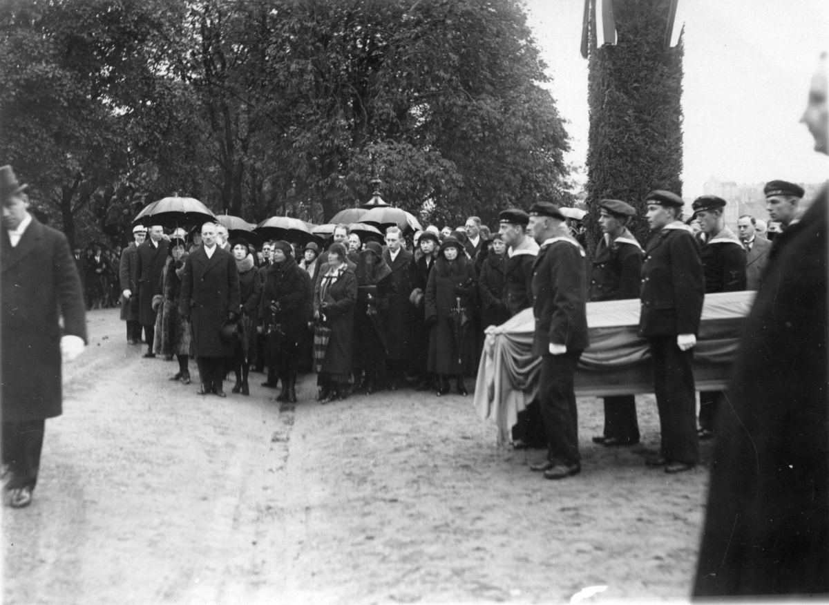 Andrées och Strindbergs släktingar i processionen från HMS Svensksund vid Skeppsholmen till Storkyrkan.