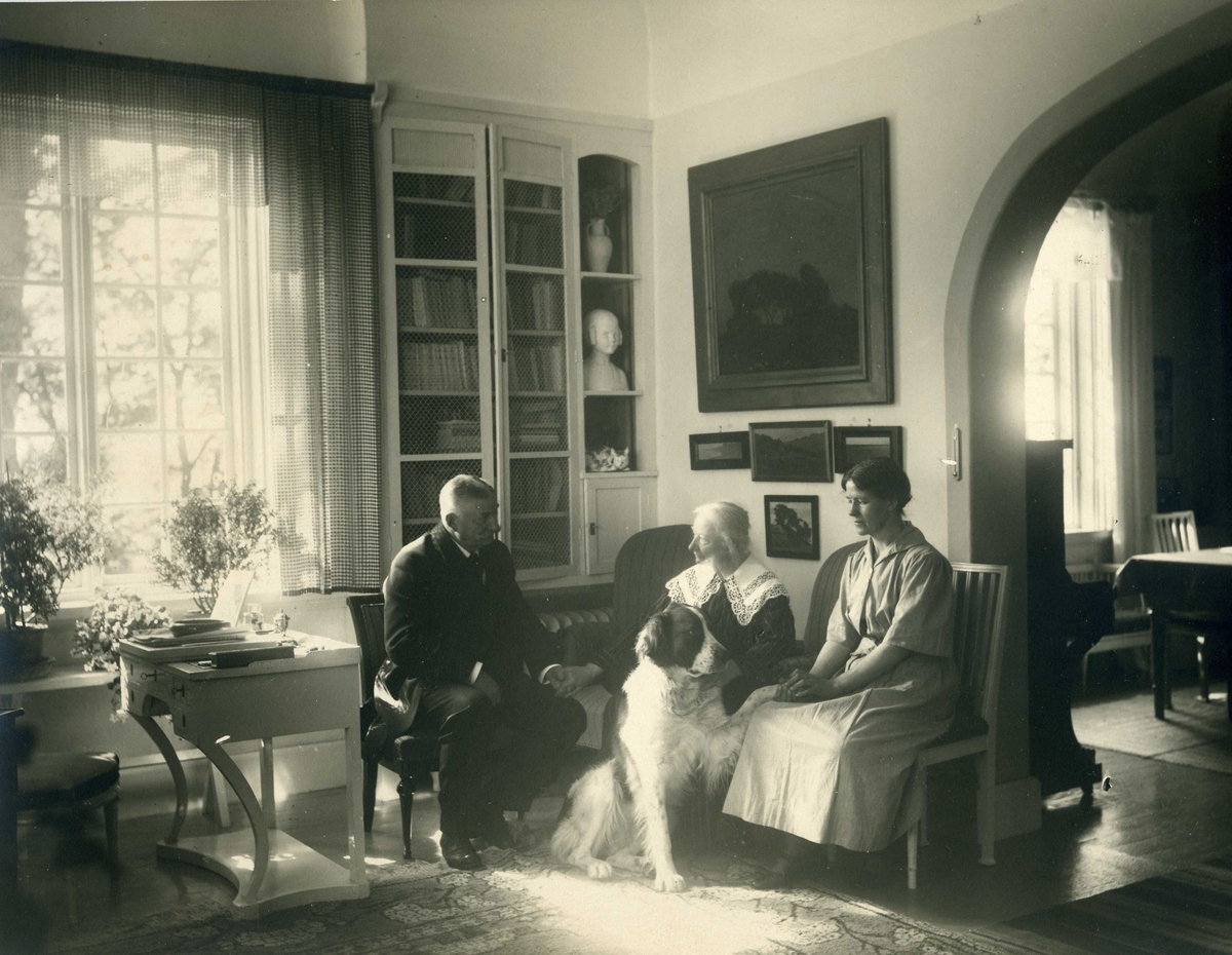 Interiör från Strand med Ellen Key i mitten, brodern W O Mac, Malin Blomsterberg och hunden Gull.