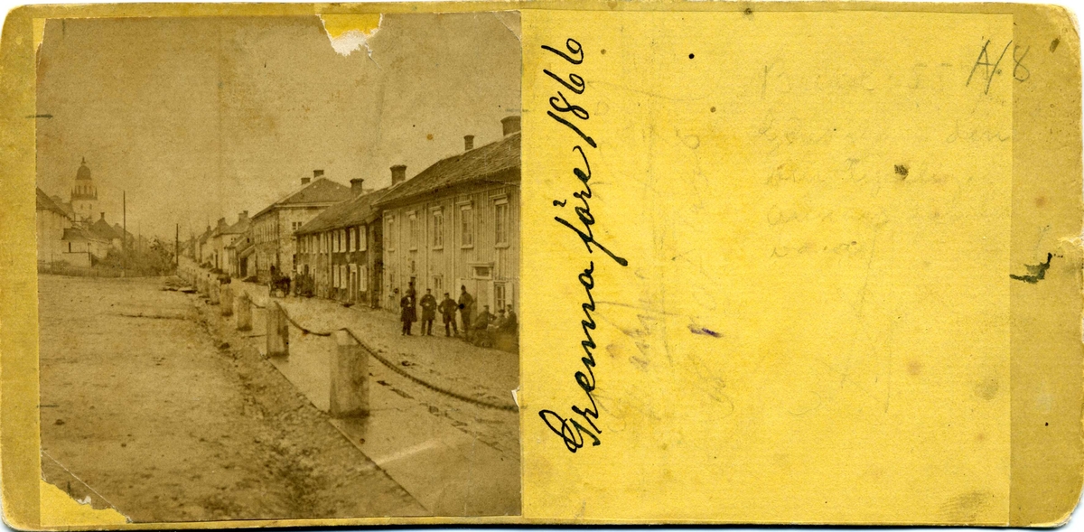 Brahegatan i Gränna, från torget och söderut. Monterat på kartong för stereoskopisk bild.