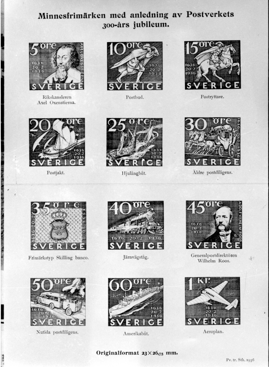 Fotografi av minnesfrimärken med anledning av Postverkets 300-års jubileum