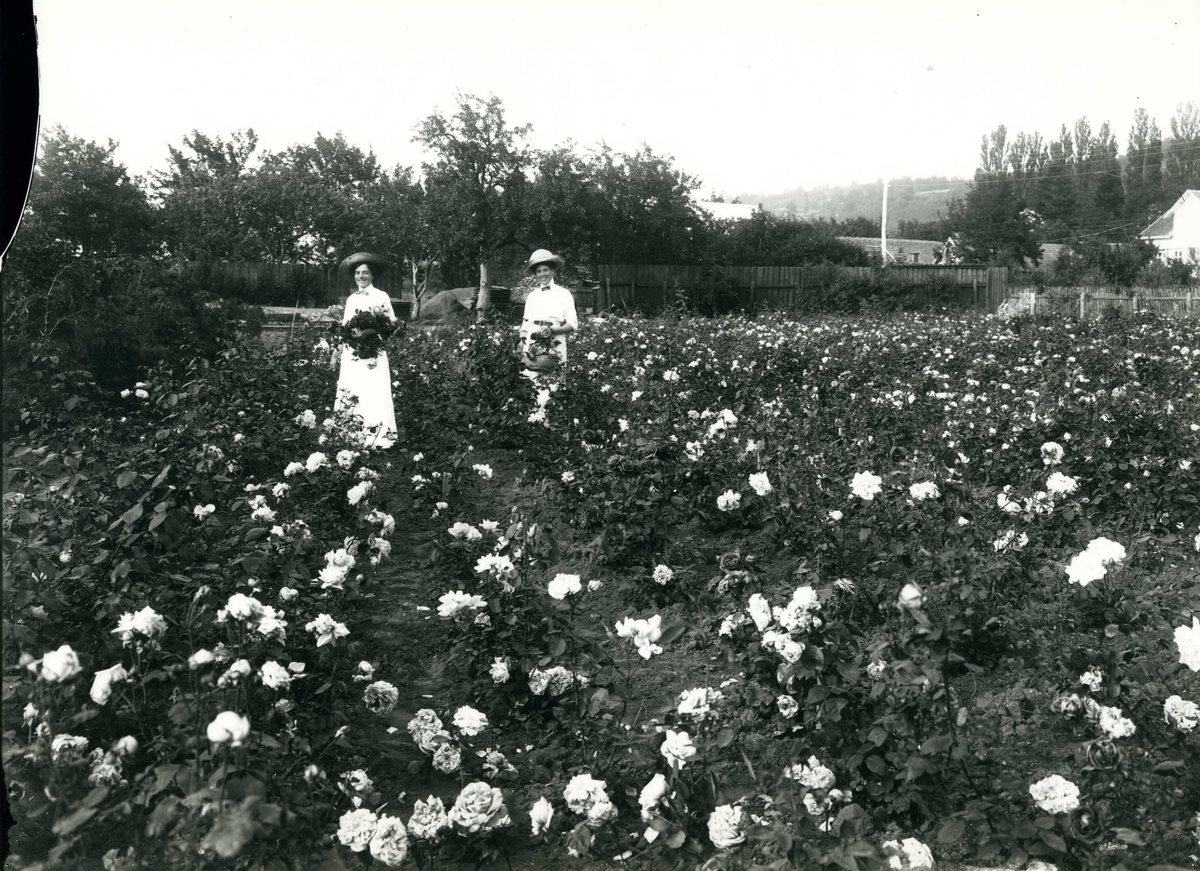 Okända kvinnor bland rosor. Troligen en plantskola i Gränna.