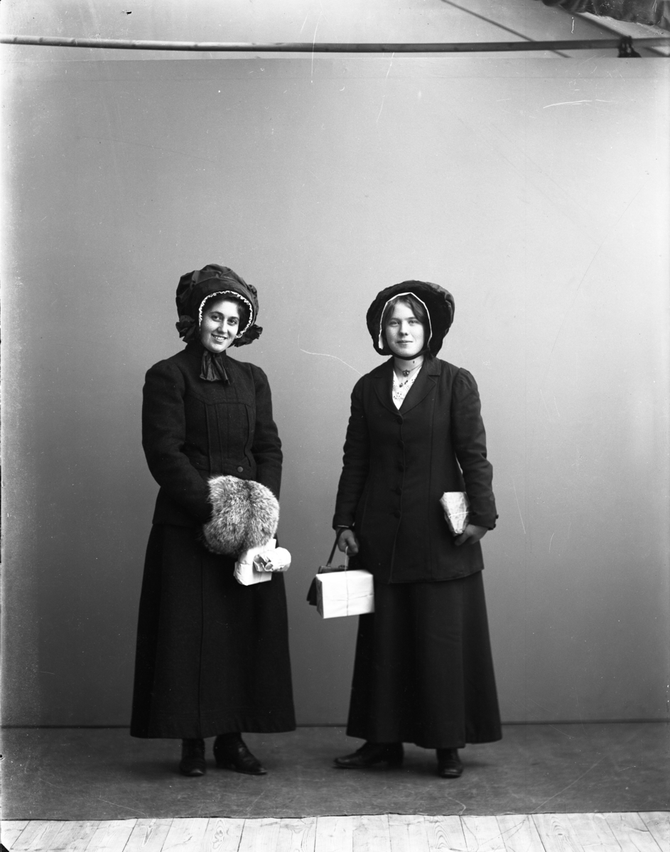 Fröken Ritz från Stora Hultrum med oidentifierad väninna. Vinterklädda i ateljén, med paket i händerna. Julklappar?