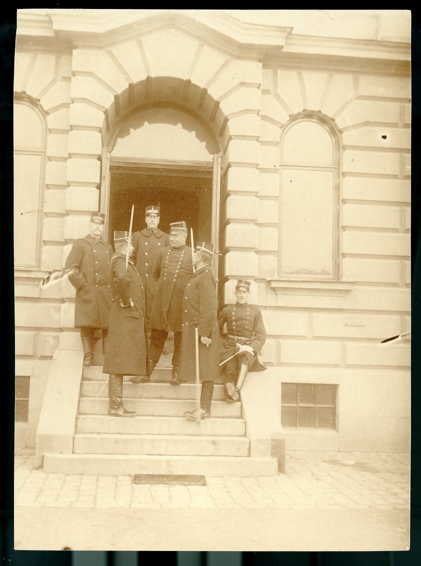 Sex officerare på trappan till okänd kasern. Längst ned står mittemot varandra med draget blankt vapen. Högst upp i mitten sannolikt T Boije Hjertström.