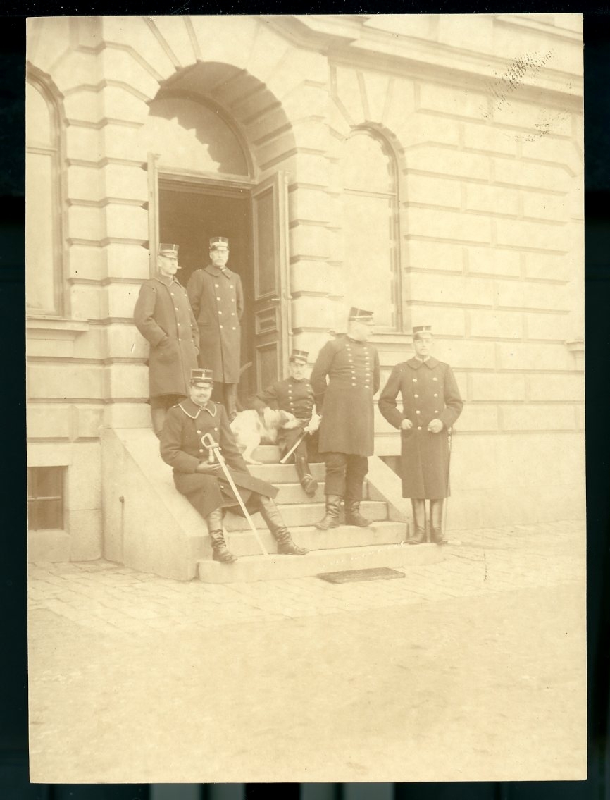 Sex officerare och en hund på trappan till okänd kasern. Längst ned står mittemot varandra med draget blankt vapen. Högst upp till höger står sannolikt T Boije Hjertström.