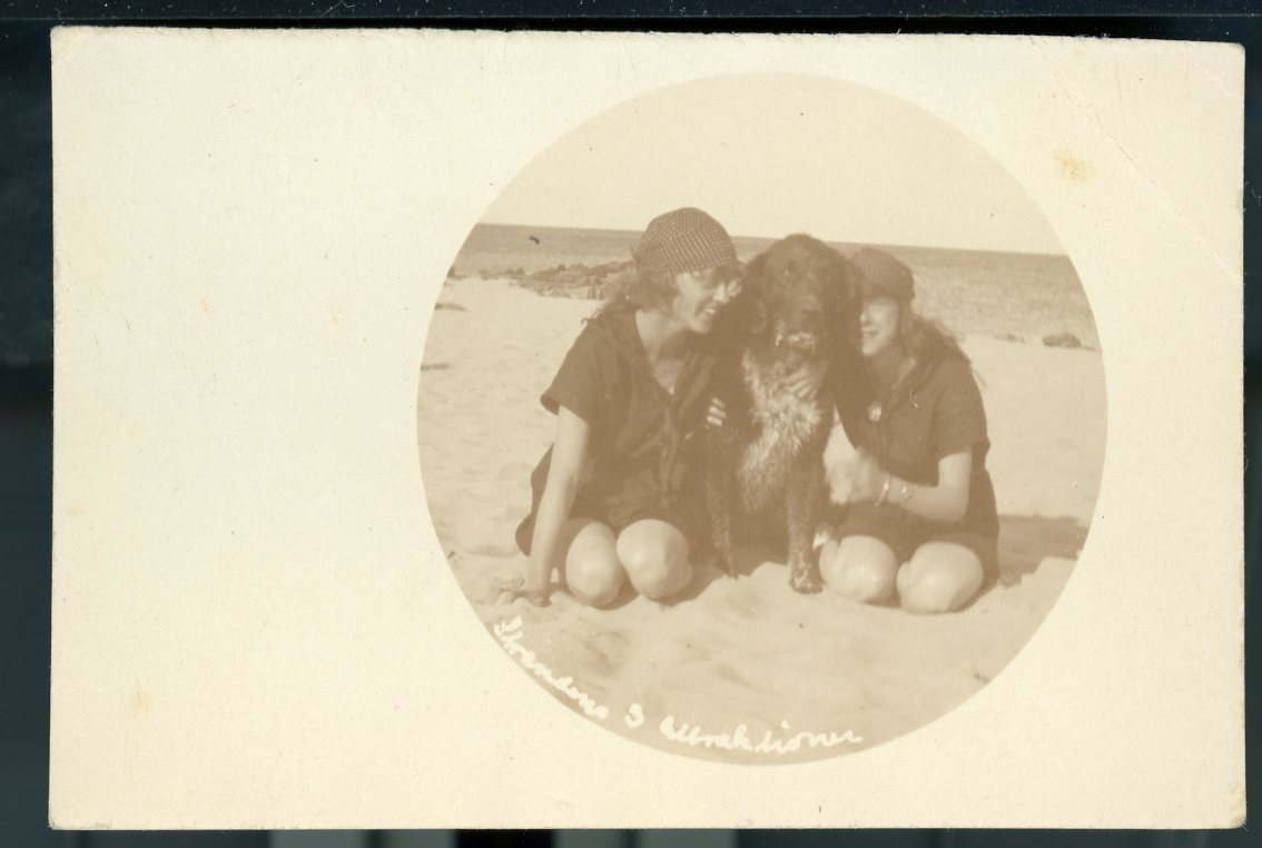 Två unga flickor sittande på en sandstrand med en större hund emellan sig.