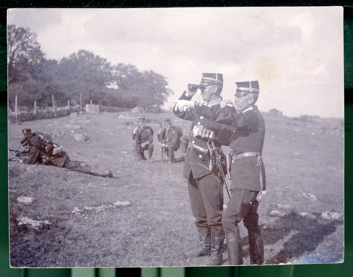 Sannolikt manöver, på okänd plats. T Boije Hjerström till höger, pekar med ena handen och den andra på Adlerbjelkes axel som tittar i kikare.