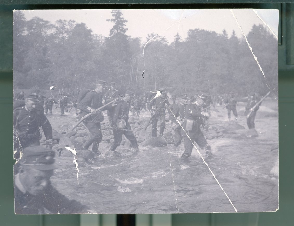Manöver på okänd plats. Militärer med gevär i handen korsar ett vattendrag.