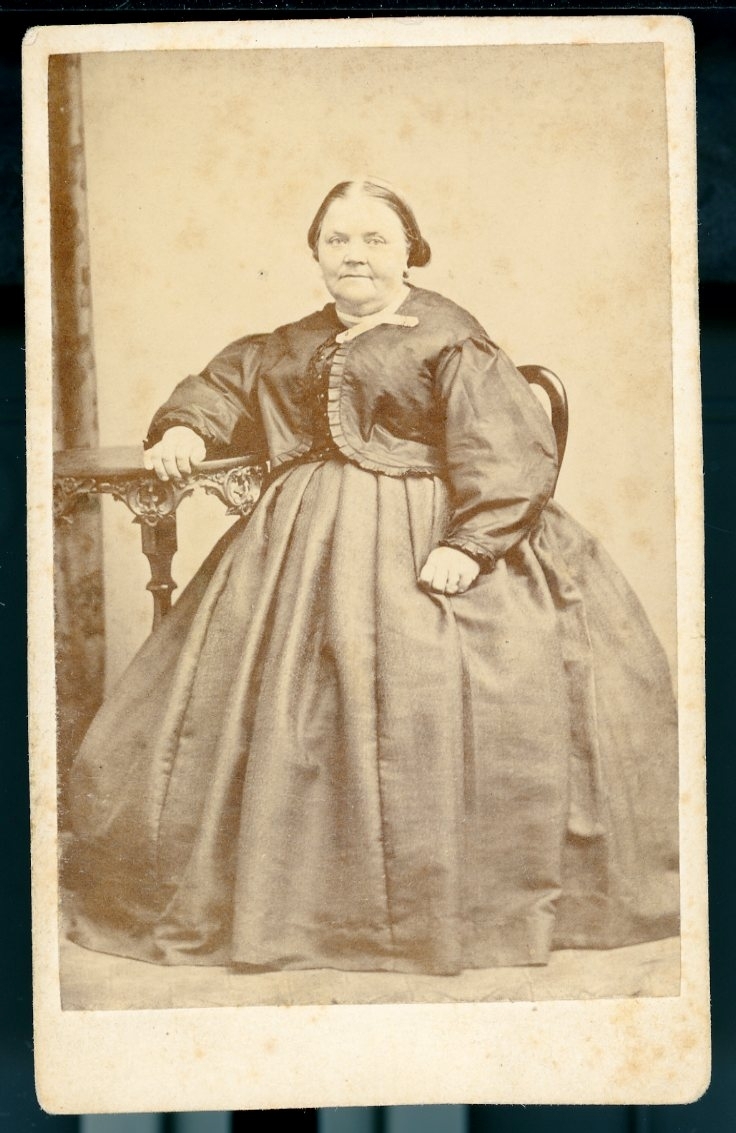 Kabinettsfotografi: prostinnan Maria Bergwall på Visingsö, sitter vid ett bord i en vid mörk klänning.