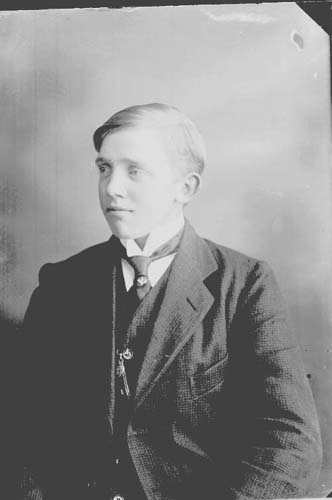 Algot Larsson, en ung man i kostym, väst, kravatt och klockkedja.