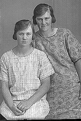 Två kvinnor i sommarklänning. En av dem är Svea Larsson.