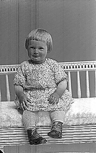 Märta Jansson, en liten flicka i klänning sittande på en soffa av sengustavianskt snitt.