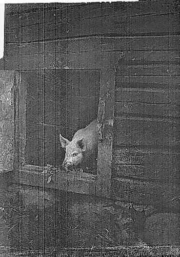 Snickarmästare Axel Johanssons gris kikar ut ur stian.