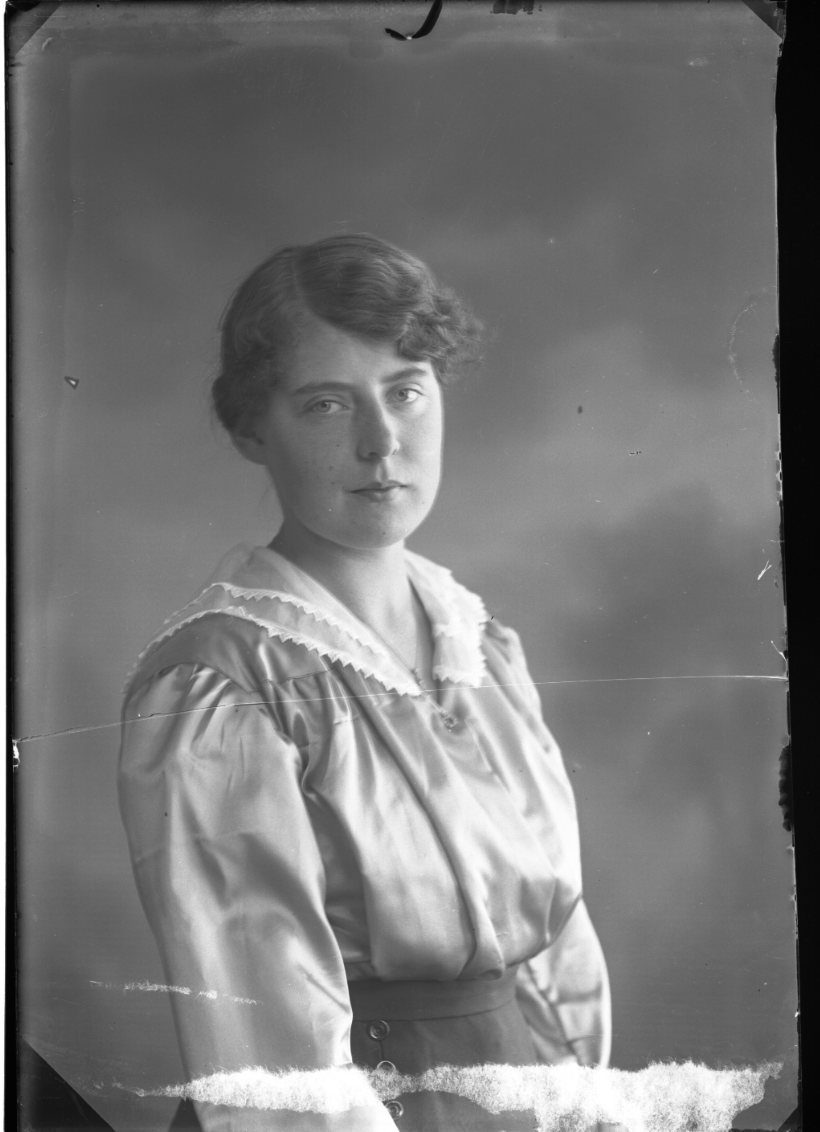 Porträtt av okänd kvinna i blank blus med ljus spetskrage.