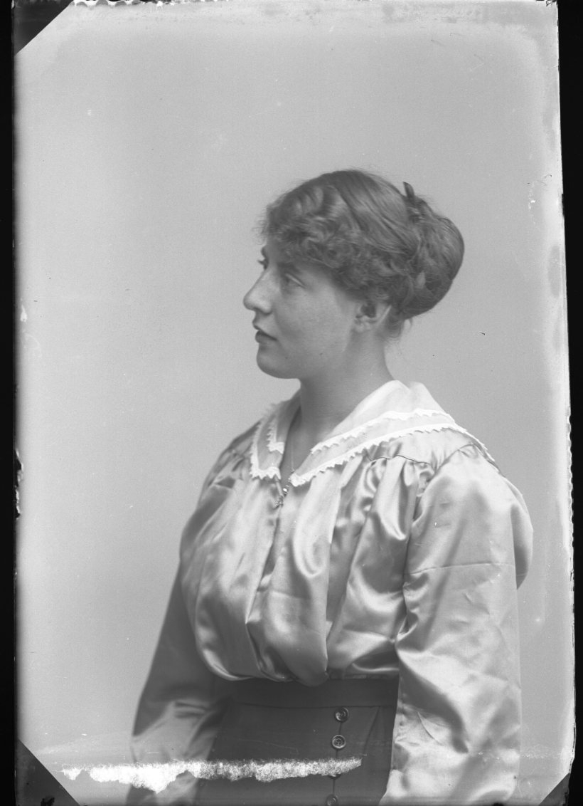 Porträtt av okänd kvinna i blank blus med ljus spetskrage. Troligen Karin Rythén.