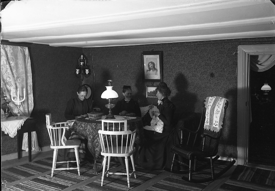 Okänd hemmiljö med tre kvinnor som sitter med sömnad vid ett runt bord. På detsamma står en stor fotogenlampa.