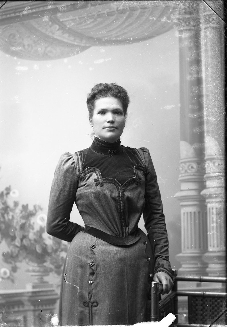 Porträtt av okänd kvinna i mörk klänning med markerad midja.