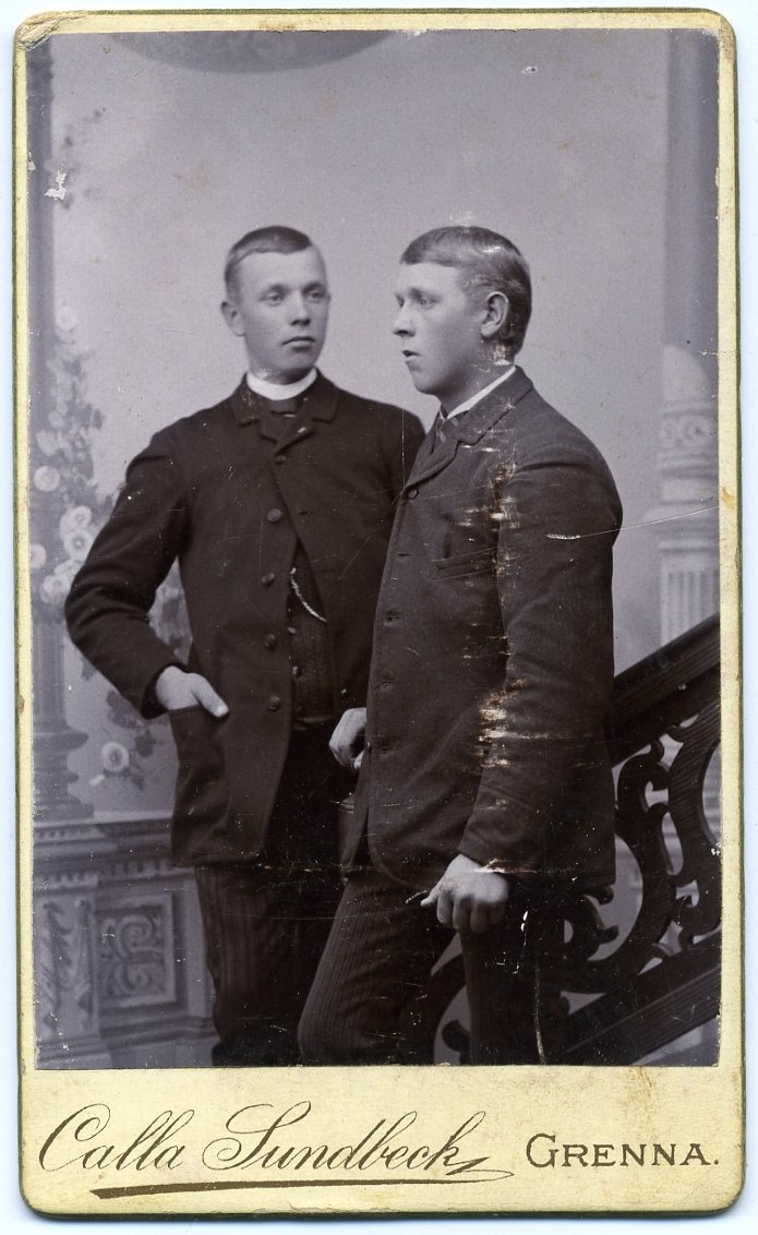 Kabinettsfotografi: två unga okända män. En stående i profil delvis framför den andra rakt framifrån.