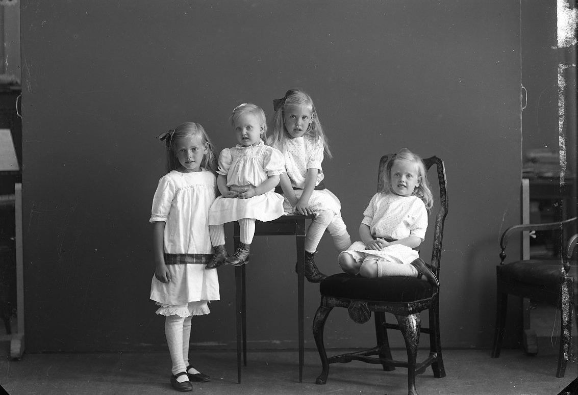 Troligen en syskongrupp. Fyra flickor som står, sitter på ett litet bord och på en stol. Gissningsvis mellan 1 och 6 år. De äldre flickorna har rosett i håret.