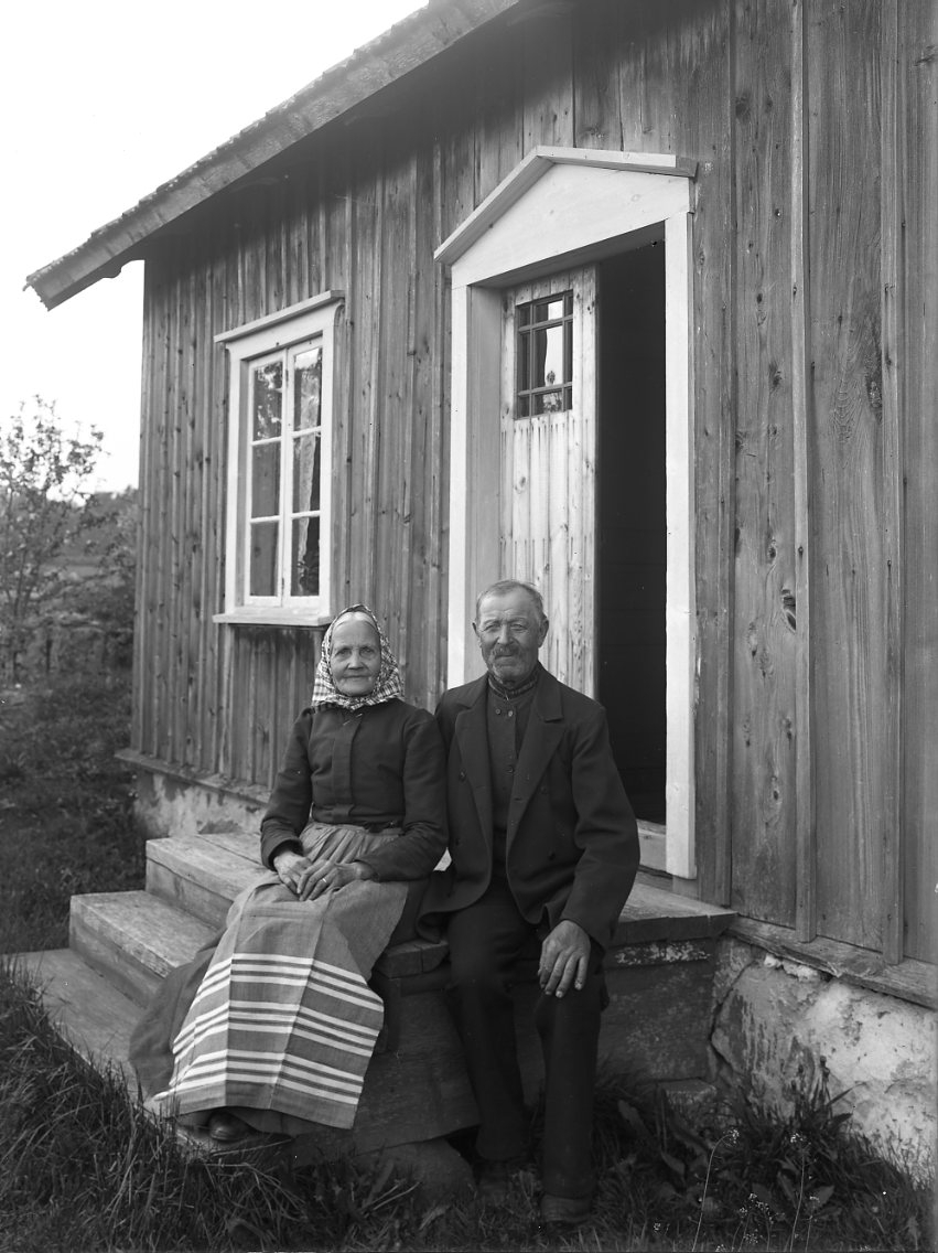 Ett äldre par sitter på farstutrappan till en liten envåningsstuga med locklistpanel. Kvinna bär huckle och ett förkläde som är randigt på nedre delen.