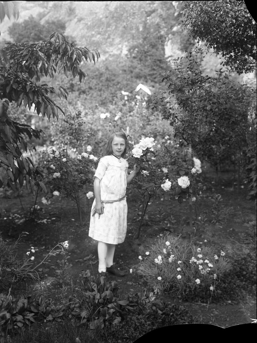 En flicka i ljus klänning står i en trädgård intill en hög rosenbuske.