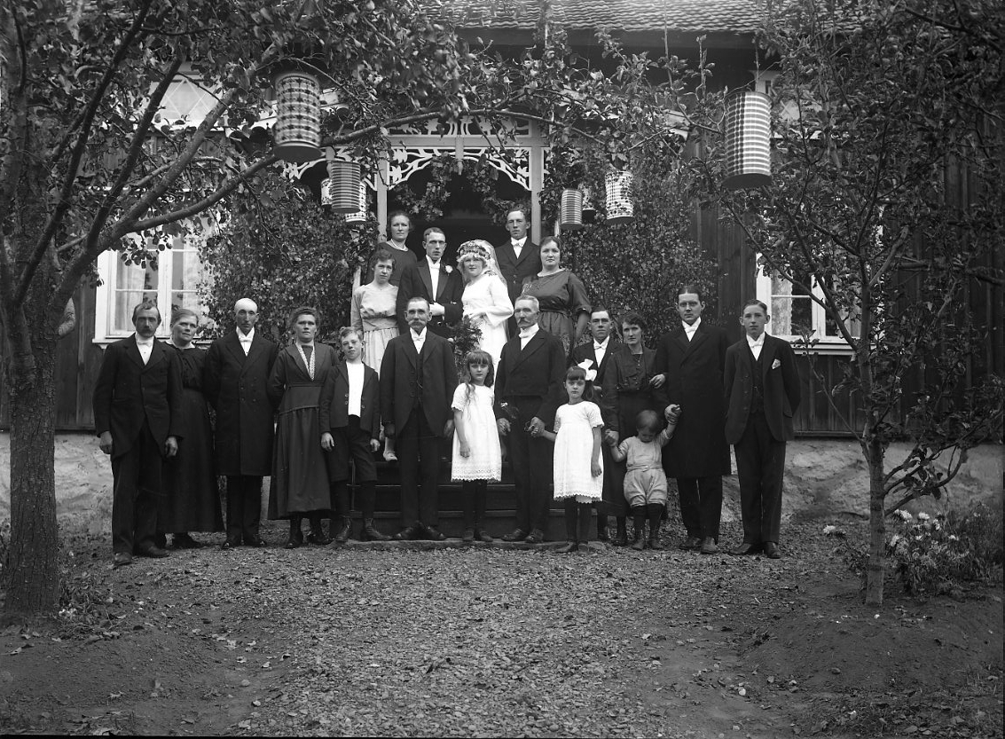 Okänt bröllopssällskap stående vid en lövad farstukvist.