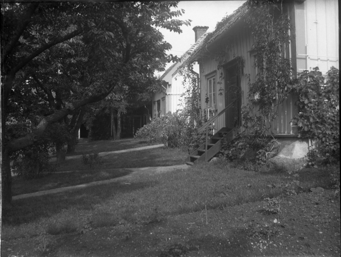 Flygelbyggnaderna på Borgmästargården från söder, i skugga av träd.