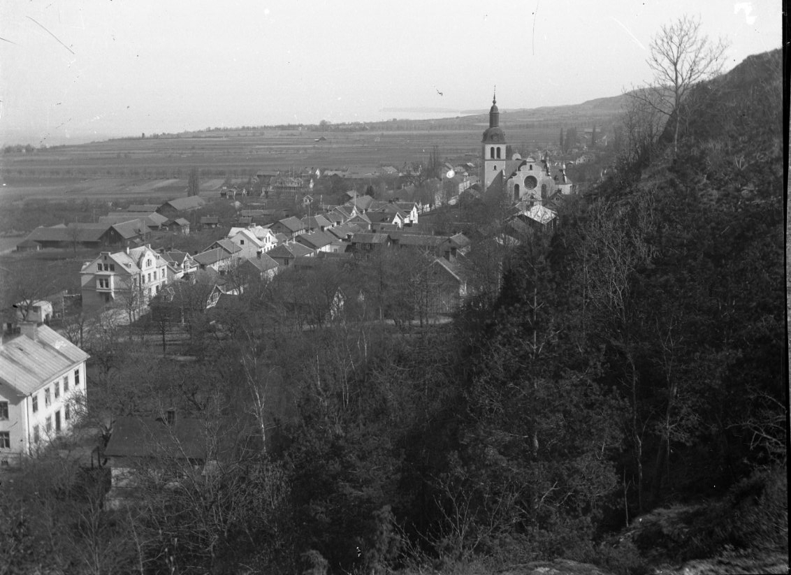 Utsikt från södra delen av Grännaberget norrut via Gränna kyrka. Till vänster i bild skymtar fastigheten Jönköpingsvägen 1 strax söder om Södra parken.