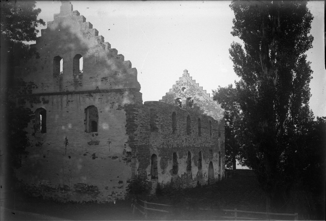 Visingsborgs slottsruin från väster. Höga träd växer tätt inpå.