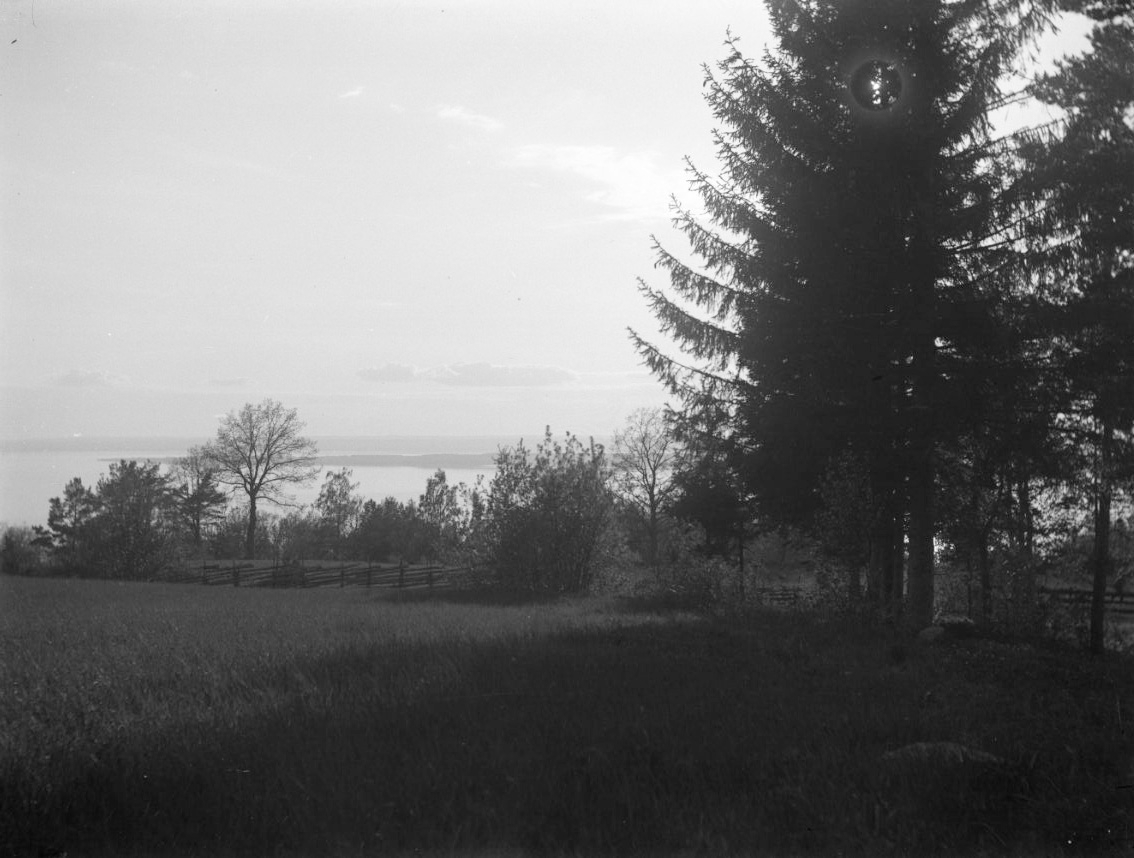 Utsikt från Grännaberget mot södra delen av Visingsö. I bilden syns granar, lövträd och en gärdesgård