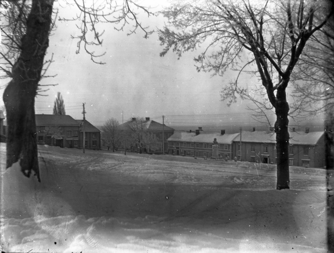 Ett snötäckt Gränna torg. Från Bergsgatan i riktning sydväst mot bland annat Brahe-bysten.