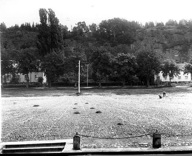 Barn rensar ogräs på Gränna torg. Man arbetar sig uppåt från Brahegatan till Bergsgatan och har kommit halvväg, upp till flaggstången. De ligger små högar med ogräs på torget.