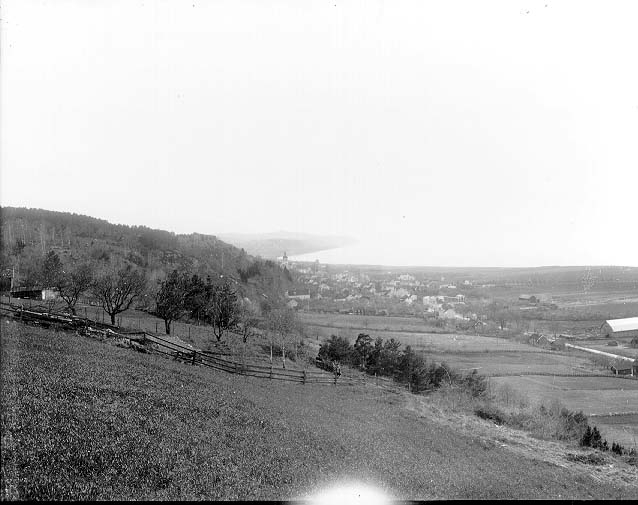 Vy från höjderna ovan Mellby mot norra delen av Gränna. Öppna fält och åkermark.