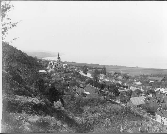 Vy från Grännaberget ned mot bebyggelsen runt Gränna torg.