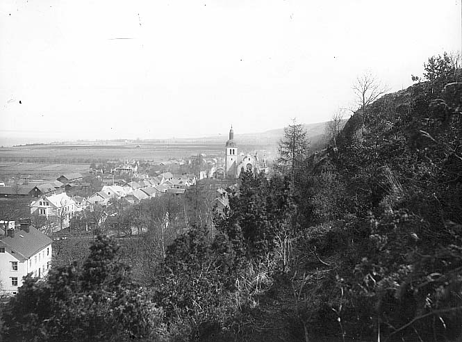 Utsikt från södra delen av Grännaberget norrut via Gränna kyrka. Till vänster i bild skymtar fastigheten Jönköpingsvägen 1 strax söder om Södra parken.