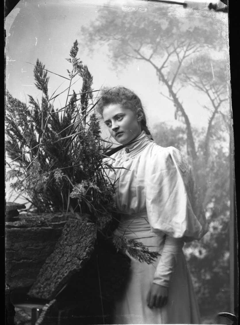Porträtt av fröken Ester Grönberg. Hon står lite drömmande lutad mot vad som möjligen ska vara en stubbe. Omgiven av växtlighet och en fond med samma motiv.