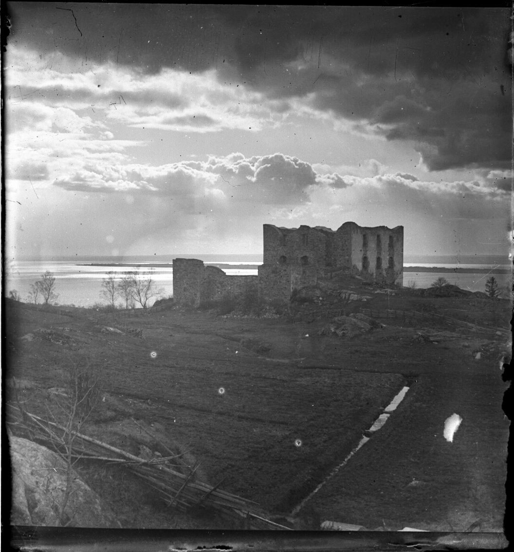 Fotografi av Brahehus slottsruin mot en mulen himmel över Vättern.
