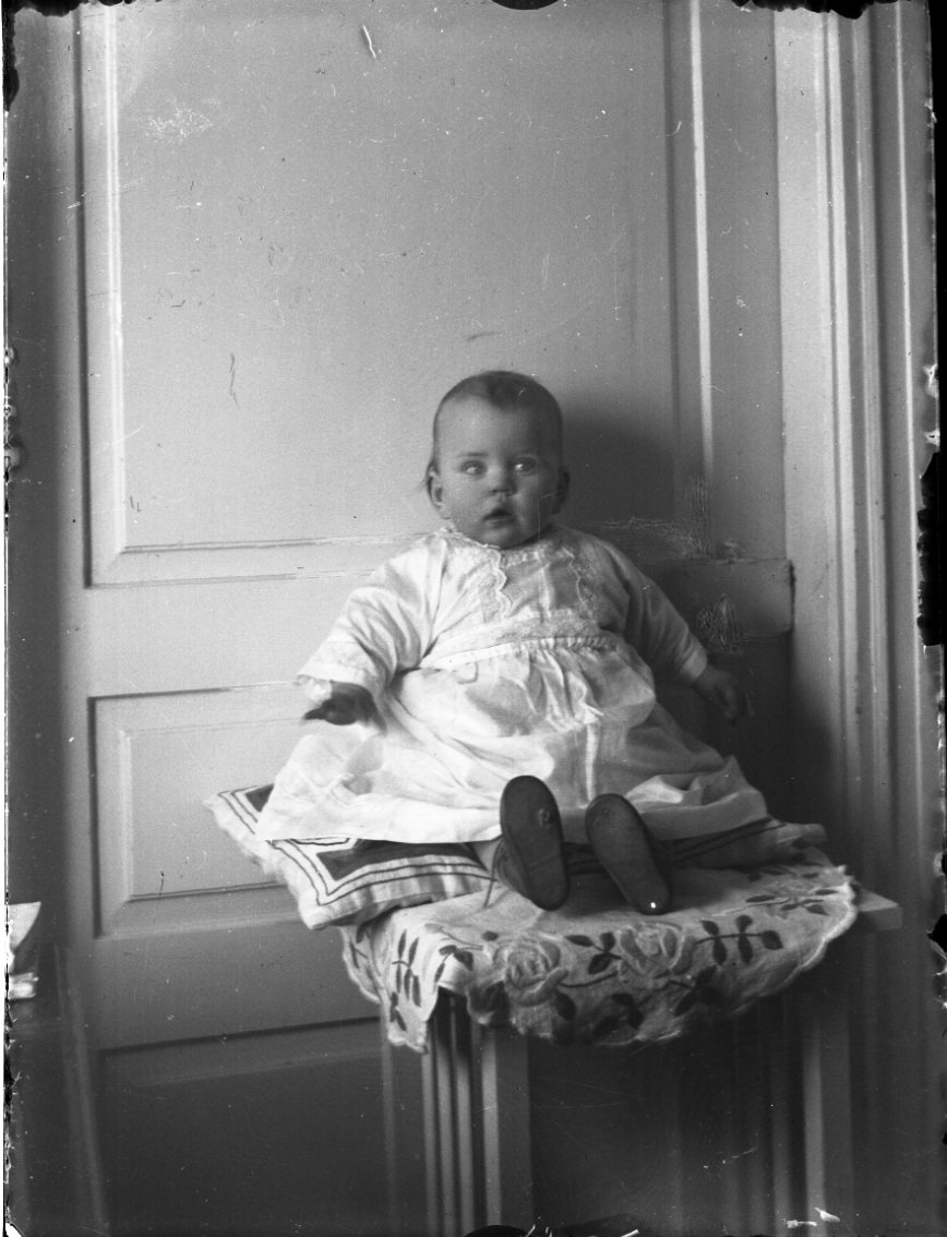Fotografi av okänt spädbarn som sitter på en kudde på ett litet bord lutad mot en dörr.