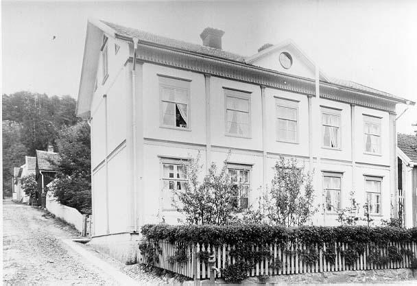 En tvåvåningsbyggnad med locklistpanel. Takfot, lisener och fönsterfoder i avvikande mörkare färg.