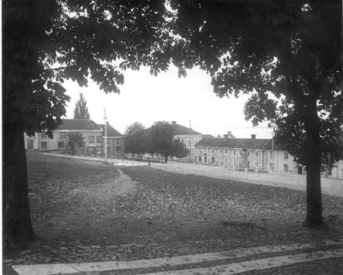 Gränna torg. Från Bergsgatan i riktning sydväst mot bland annat Brahe-bysten.