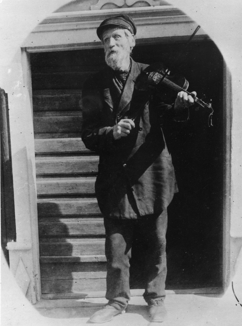 Porträtt av spelmannen "Blinde Janne" från Gränna. Han står på en farstukvist och spelar fiol.