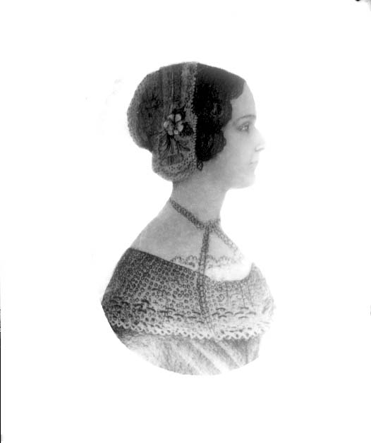 Fotografi av tecknat porträtt av okänd kvinna i profil, bröstbild. 1800-talets mitt.