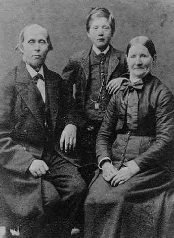 Gruppbild med familjen Eliasson i Örserum. En pojke står mellan sin pappa och mamma som sitter på stolar.