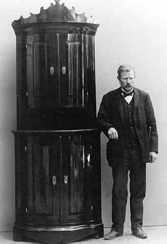 Porträtt av möbelsnickaren Anders Johansson i Måleskog stående vid ett av honom tillverkat högt skåp med välvd front.