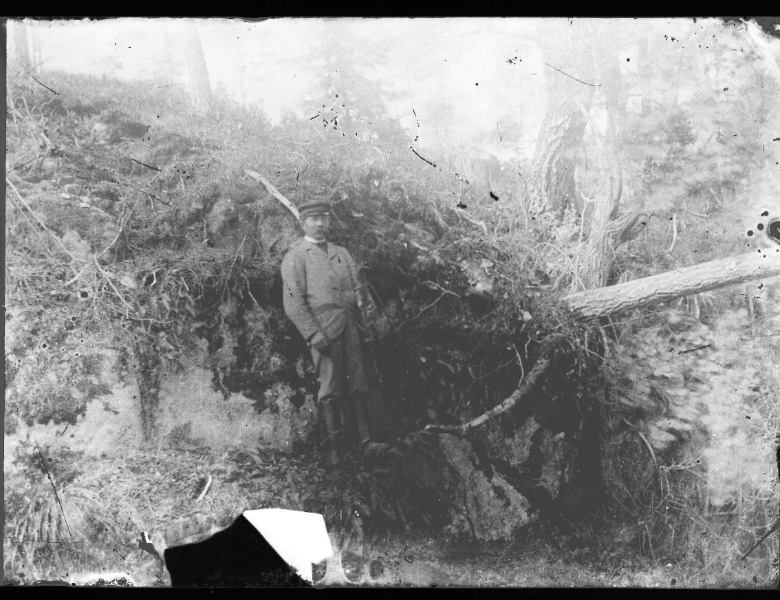 En okänd man står lutad mot en bergknalle med en rotvälta intill sig.