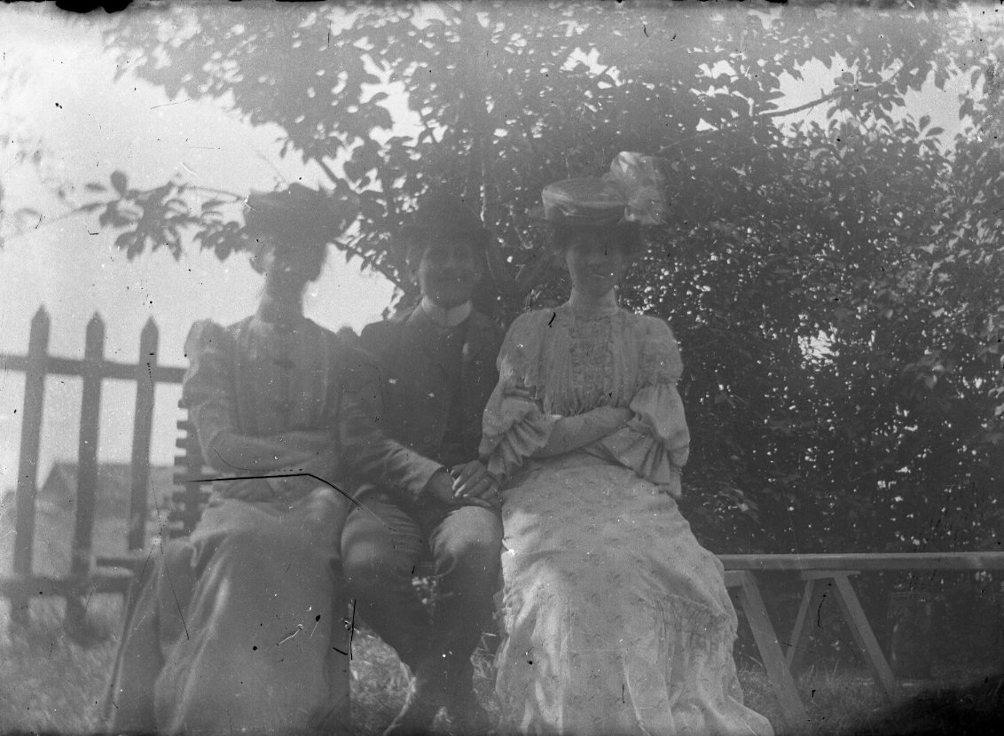 En ung man med en ung kvinna på var sida, sitter på en planka på bockar i skuggan av en hög buske. Bakom dem också ett spjälstaket.