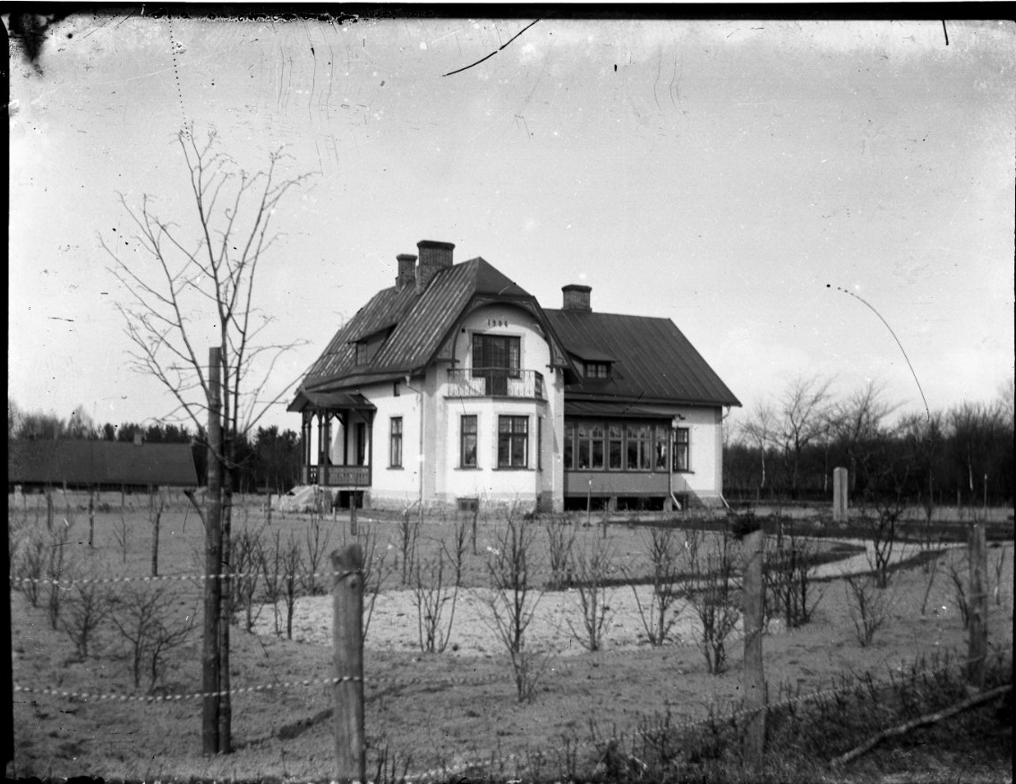 En okänd större putsad villa byggd i vinkel. Ett byggnadsår på väggen ovanför en balkong säger möjligen 1904. En nyanlagd trädgård med träd och buskar i förgrunden.